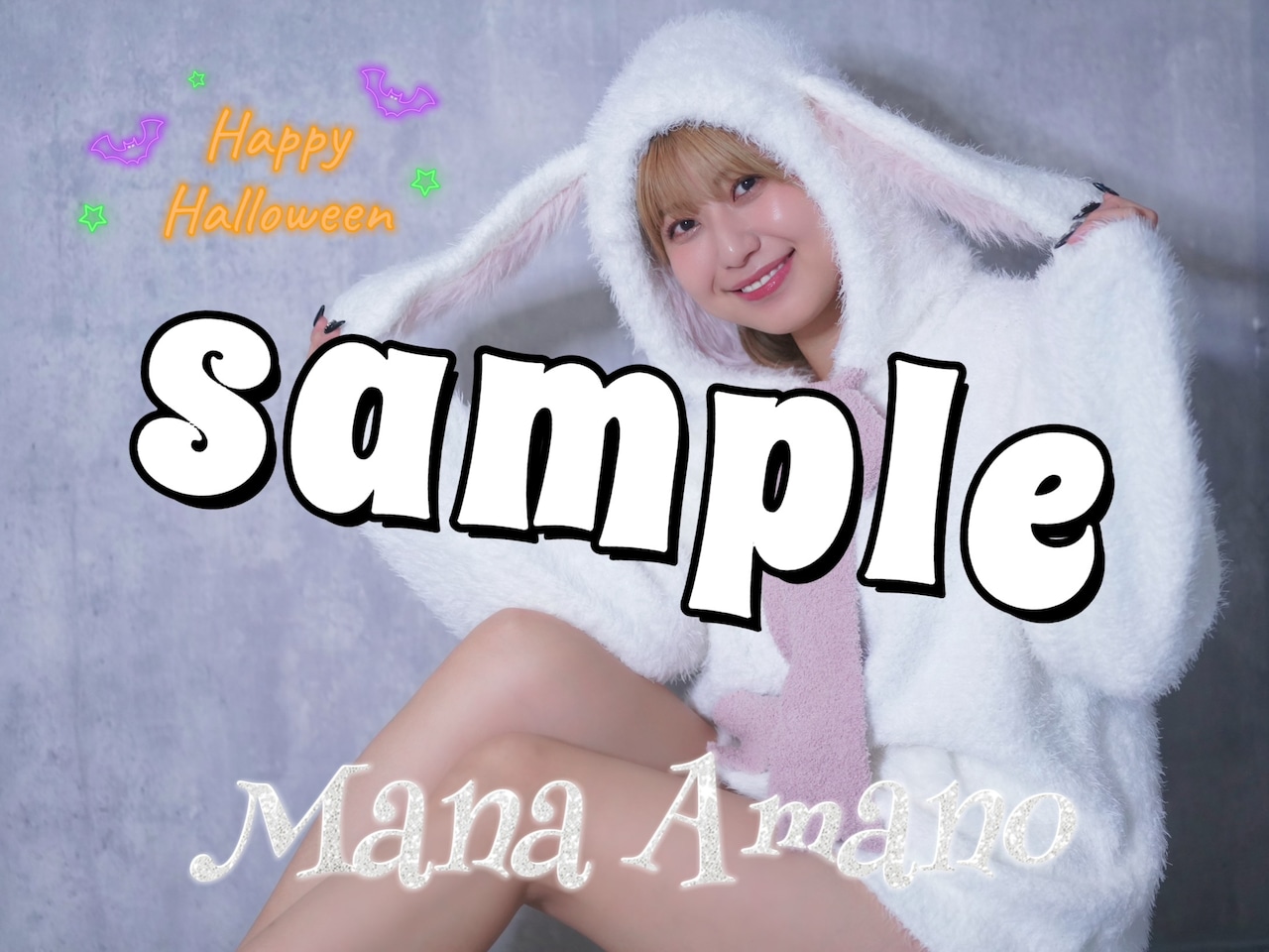 ハロウィンに合わせて白いウサギのコスプレをした写真がプリントされています。